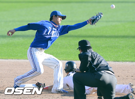 28일 오후 인천 문학구장에서 열린 2012 팔도 프로야구 삼성 라이온즈와 SK 와이번스의 한국시리즈 3차전, 2사 1루 SK 정근우의 도루때 삼성 김상수 유격수가 공을 놓치고 있다
