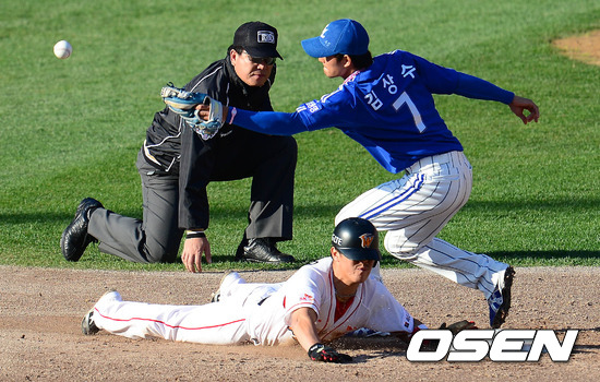 28일 오후 인천 문학구장에서 열린 '2012 팔도 프로야구' SK 와이번스와 삼성 라이온즈의 한국시리즈 3차전 경기 4회말 2사 1루 최정 타석, 정근우의 도루 시도 상황, 진갑용의 송구 실책으로 공이 빠지고 있다. 정근우는 3루까지 진루.