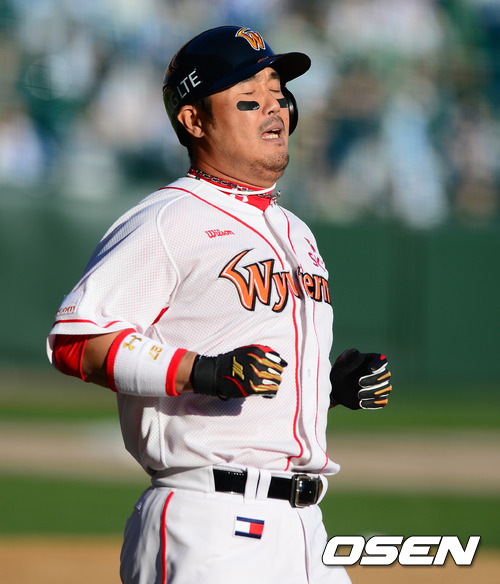 28일 오후 인천 문학구장에서 열린 2012 팔도 프로야구 삼성 라이온즈와 SK 와이번스의 한국시리즈 3차전, 4회말 2사2루에서 동점 찬스에서 SK 이호준이 내야땅볼로 물러나며 아쉬워하고 있다.