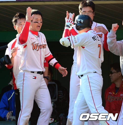 28일 오후 인천 문학구장에서 열린 2012 팔도 프로야구 삼성 라이온즈와 SK 와이번스의 한국시리즈 3차전, 4회말 무사 박진만이 솔로홈런을 치고 동료들의 환영을 받고 있다.