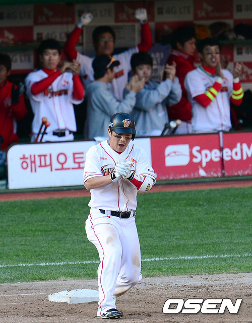 28일 오후 인천 문학구장에서 열린 '2012 팔도 프로야구' SK 와이번스와 삼성 라이온즈의 한국시리즈 3차전 경기 6회말 무사 1,3루 정근우가 1타점 적시타를 친 후 기뻐하고 있다.