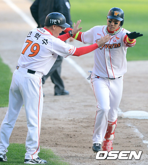 28일 오후 인천 문학구장에서 열린 2012 팔도 프로야구 삼성 라이온즈와 SK 와이번스의 한국시리즈 3차전, 6회말 2사 1,2루 SK 김강민이 3점 홈런을 날리고 한혁수 코치와 하이파이브를 하고 있다.