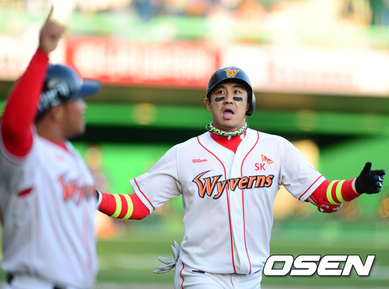 28일 오후 인천 문학구장에서 열린 2012 팔도 프로야구 삼성 라이온즈와 SK 와이번스의 한국시리즈 3차전, 6회말 2사 1,2루에서 SK 김강민이 스리런 홈런을 날리고 기뻐하고 있다.