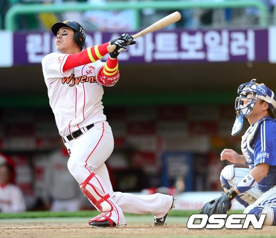 28일 오후 인천 문학구장에서 열린 2012 팔도 프로야구 삼성 라이온즈와 SK 와이번스의 한국시리즈 3차전, 6회말 2사 1,2루 김강민이 스리런 홈런을 치고 있다.