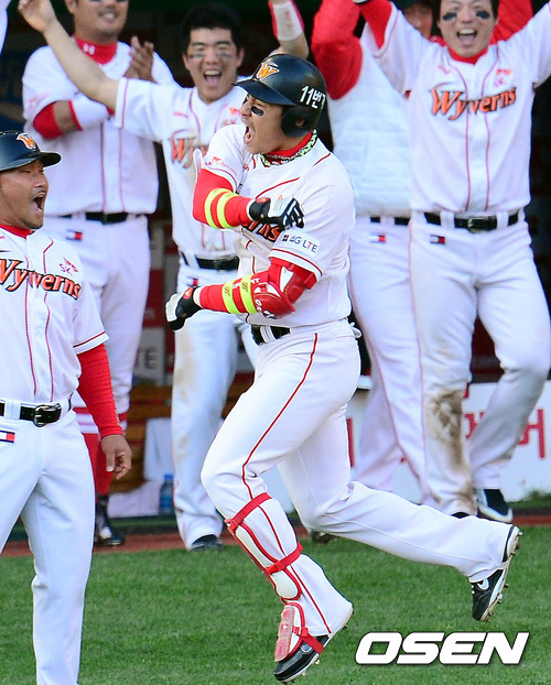 28일 오후 인천 문학구장에서 열린 '2012 팔도 프로야구' SK 와이번스와 삼성 라이온즈의 한국시리즈 3차전 경기 6회말 2사 1,2루 김강민이 스리런포를 친 후 환호하고 있다.