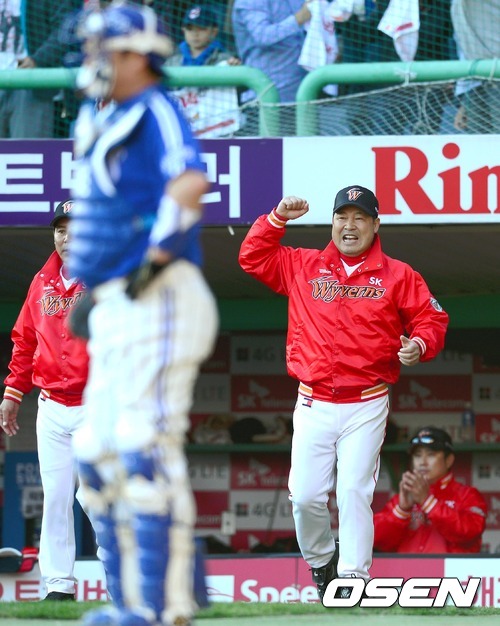 28일 오후 인천 문학구장에서 열린 2012 팔도 프로야구 삼성 라이온즈와 SK 와이번스의 한국시리즈 3차전, 6회말 1사 1,3루 김상수의 실책으로 역전을 한 SK 이만수 감독이 환호하고 있다.