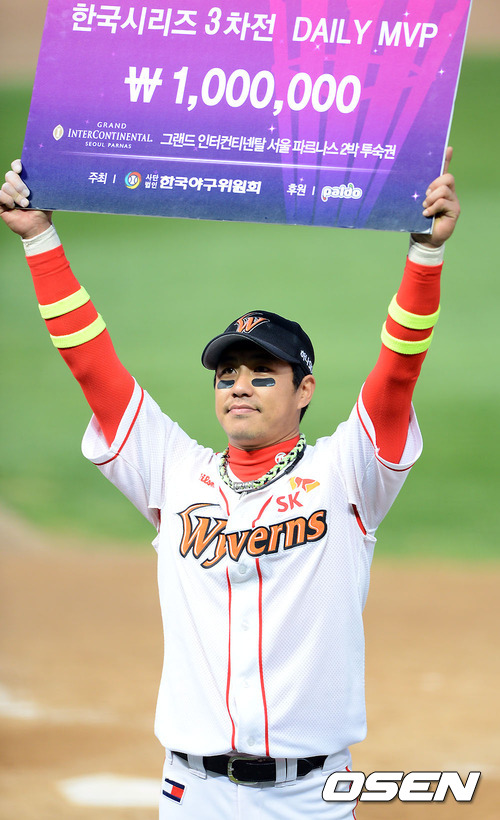 경기종료 후 MVP로 선정된 SK 김강민이 판넬을 들고 포즈를 취하고 있다. / soul1014@osen.co.kr
