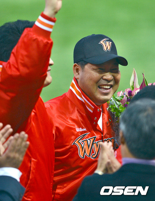 경기종료 후 SK 이만수 감독이 권영길 인천시장에게 꽃다발 선물을 받은 후 미소 짓고 있다./ soul1014@osen.co.kr