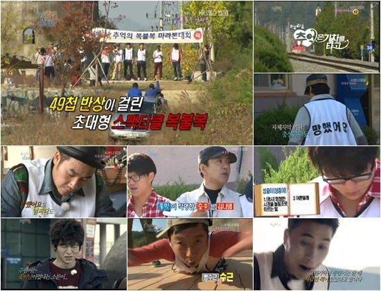 28일 오후 방송된 KBS 2TV ‘해피선데이-1박2일’(이하 1박2일)은 ‘추억은 기차를 타고’라는 주제로 경상북도 군위로 떠난 멤버들의 첫 번째 이야기가 방송됐고, 1970~1980년대 까지의 옛 모습을 그대로 간직한 화본마을에서 멤버들은 3km의 거리를 뛰는 복불복 마라톤대회에 참가하게 됐다.