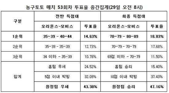 국민체육진흥공단(www.kspo.or.kr)이 발행하는 체육진흥투표권 수탁사업자인 스포츠토토 공식 온라인 발매사이트인 베트맨(www.betman.co.kr)이 오는 30일 오후 7시 고양체육관에서 벌어지는 고양오리온스-울산모비스 전 대상 농구토토 매치 53회차 투표율을 중간 집계한 결과, 전체 참가자의 47.16%가 원정팀 모비스의 승리를 예상했다고 밝혔다.