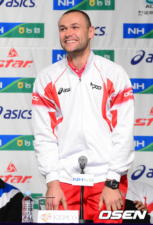 29일 오전 서울 여의도 63컨벤션센터에서 열린 'NH농협 프로배구 2012-2013' 남자부 미디어데이에서 KEPCO 외국인 선수 안젤코가 인사를 하고 있다.
