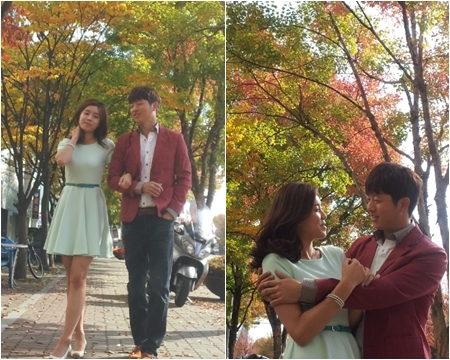 사진 속 유상무는 단풍잎이 아름답게 펼쳐진 길거리에서 장도연과 자연스럽게 팔짱을 끼며 걷고 있다. 장도연은 한눈에도 차려입은 듯한 여성스러운 원피스를 입고 약간 쑥스러운 듯 목덜미를 만지고 있다.