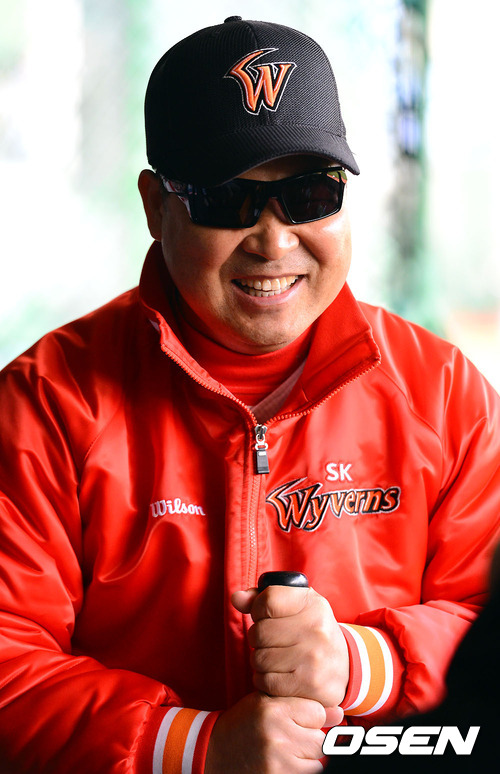 29일 오후 인천 문학구장에서 열린 '2012 팔도 프로야구' SK 와이번스와 삼성 라이온즈의 한국시리즈 4차전, 경기에 앞서 SK 이만수 감독이 미소 지으며 인터뷰를 하고 있다