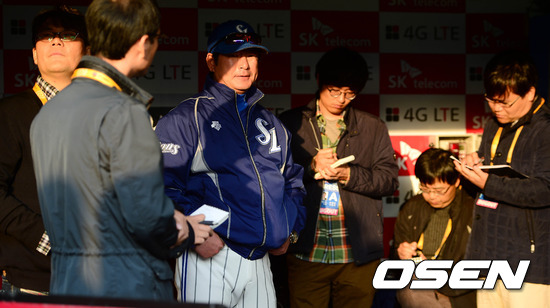 29일 오후 인천 문학구장에서 열리는 '2012 팔도 프로야구' SK 와이번스와 삼성 라이온즈의 한국시리즈 4차전 경기 시작 전 류중일 감독이 취재진들과 이야기를 나누고 있다.