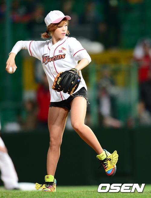29일 오후 인천 문학구장에서 열린 '2012 팔도 프로야구' SK 와이번스와 삼성 라이온즈의 한국시리즈 4차전 인기 걸그룹 시크릿의 효성이 멋진 폼으로 시구를 하고 있다.