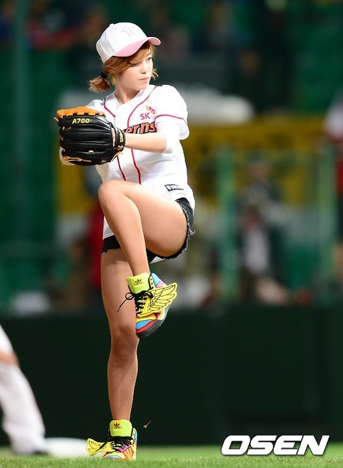 29일 오후 인천 문학구장에서 열린 '2012 팔도 프로야구' SK 와이번스와 삼성 라이온즈의 한국시리즈 4차전 인기 걸그룹 시크릿의 효성이 멋진 폼으로 시구를 하고 있다.