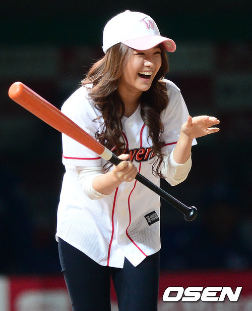 29일 오후 인천 문학구장에서 열린 '2012 팔도 프로야구' SK 와이번스와 삼성 라이온즈의 한국시리즈 4차전, 경기에 앞서 가수 시크릿 송지은이 시타를 마치고 즐거워하고 있다