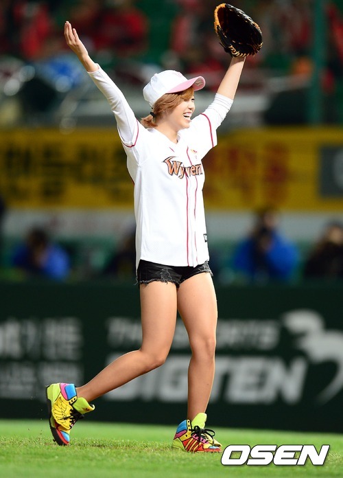 29일 오후 인천 문학구장에서 열린 '2012 팔도 프로야구' SK 와이번스와 삼성 라이온즈의 한국시리즈 4차전 인기 걸그룹 시크릿의 효성이 멋진 폼으로 시구를 하고 있다.