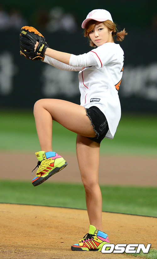 29일 오후 인천 문학구장에서 열린 '2012 팔도 프로야구' SK 와이번스와 삼성 라이온즈의 한국시리즈 4차전, 경기에 앞서 시크릿 효성이 시구를 하고 있다