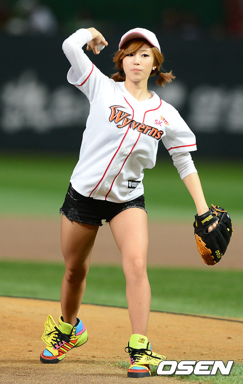 29일 오후 인천 문학구장에서 열린 '2012 팔도 프로야구' SK 와이번스와 삼성 라이온즈의 한국시리즈 4차전, 경기에 앞서 시크릿 효성이 시구를 하고 있다