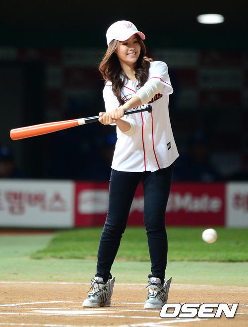 29일 오후 인천 문학구장에서 열린 '2012 팔도 프로야구' SK 와이번스와 삼성 라이온즈의 한국시리즈 4차전, 경기에 앞서 가수 시크릿 송지은이 시타자로 나서 헛스윙하고 있다