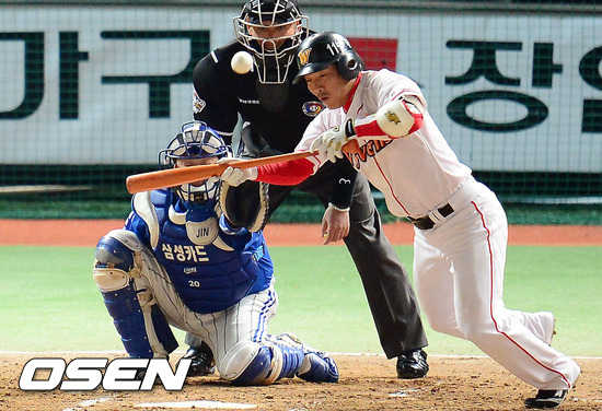 29일 오후 인천 문학구장에서 열린 '2012 팔도 프로야구' SK 와이번스와 삼성 라이온즈의 한국시리즈 4차전 경기 1회말 선두타자 정근우가 기습번트를 시도해봤지만, 실패하고 있다.