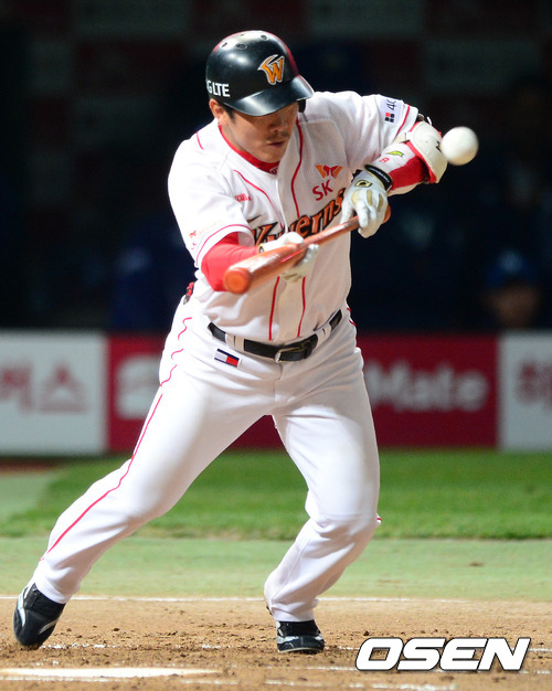 29일 오후 인천 문학구장에서 열린 '2012 팔도 프로야구' SK 와이번스와 삼성 라이온즈의 한국시리즈 4차전, 1회말 무사에서 SK 정근우가 기습번트를 시도하고 있다. 하지만 1루에서 아웃.