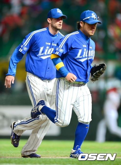 29일 오후 인천 문학구장에서 열린 '2012 팔도 프로야구' SK 와이번스와 삼성 라이온즈의 한국시리즈 4차전 1회말 탈보트가 번트 수비등 좋은 수비를 펼친 박석민의 엉덩이를 두드려준 후 함께 더그아웃으로 가고 있다.