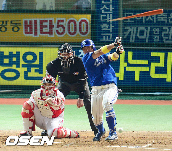 29일 오후 인천 문학구장에서 열린 '2012 팔도 프로야구' SK 와이번스와 삼성 라이온즈의 한국시리즈 4차전 경기 2회초 2사 조동찬이 내야땅볼을 치며 방망이가 부러지고 있다.