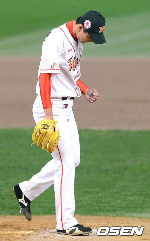 29일 오후 인천 문학구장에서 열린 '2012 팔도 프로야구' SK 와이번스와 삼성 라이온즈의 한국시리즈 4차전, 1회초 SK 선발투수 김광현이 삼성의 공격을 막은 후 주먹을 쥐며 환호하고 있다