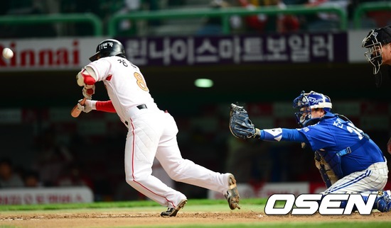 29일 오후 인천 문학구장에서 열린 '2012 팔도 프로야구' SK 와이번스와 삼성 라이온즈의 한국시리즈 4차전 1회말 SK 선두타자 정근우가 세이프티 번트를 시도하고 있다. 3루 땅볼로 아웃.