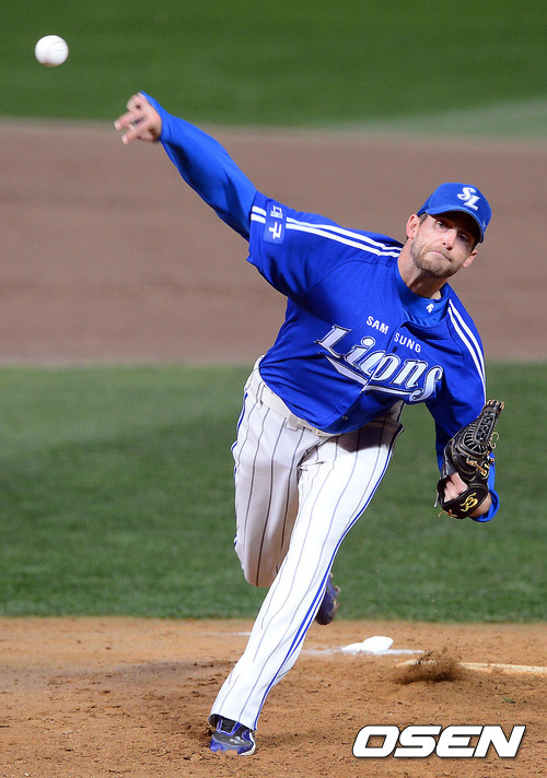 29일 오후 인천 문학구장에서 열린 '2012 팔도 프로야구' SK 와이번스와 삼성 라이온즈의 한국시리즈 4차전, 1회말 삼성 선발투수 탈보트가 역투하고 있다