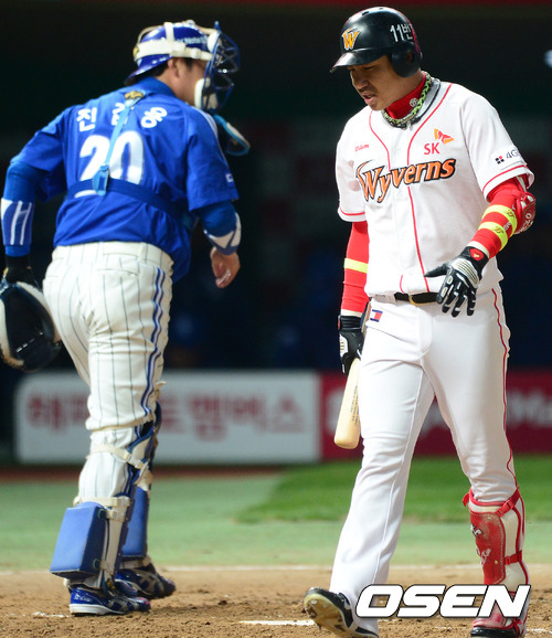 29일 오후 인천 문학구장에서 열린 '2012 팔도 프로야구' SK 와이번스와 삼성 라이온즈의 한국시리즈 4차전, 2회말 2사에서 SK 김강민이 삼진을 당하고 아쉬워하고 있다