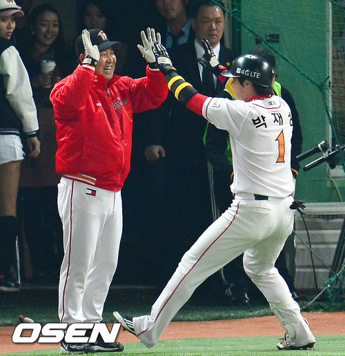 29일 오후 인천 문학구장에서 열린 '2012 팔도 프로야구' SK 와이번스와 삼성 라이온즈의 한국시리즈 4차전 경기 4회말 1사 박재상이 솔로포를 친 후 이만수 감독과 하이파이브를 하고 있다.