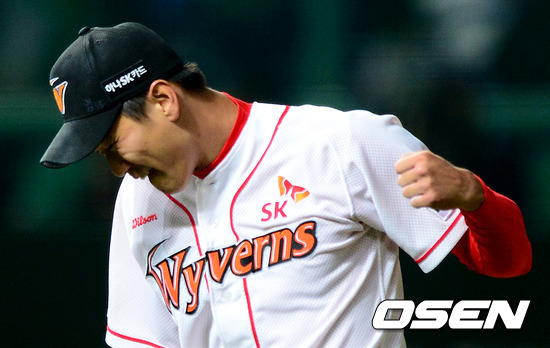 29일 오후 인천 문학구장에서 열린 '2012 팔도 프로야구' SK 와이번스와 삼성 라이온즈의 한국시리즈 4차전, 5회초 2사 2루에서 SK 김광현이 삼성 박한이를 외야플라이로 처리하고 기뻐하고 있다