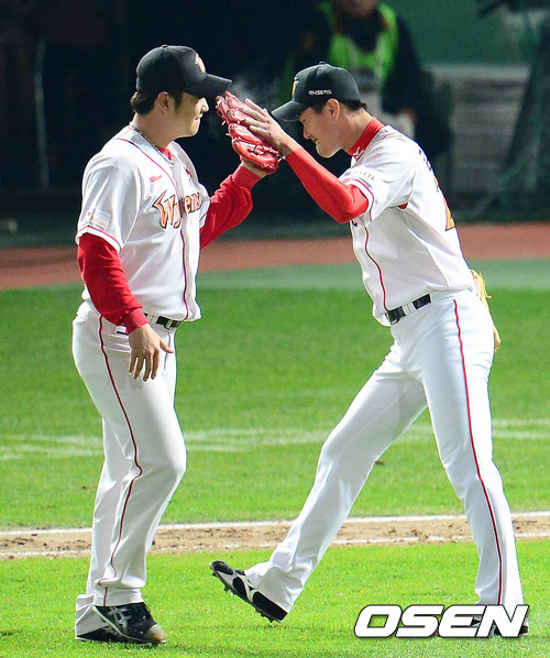 29일 오후 인천 문학구장에서 열린 '2012 팔도 프로야구' SK 와이번스와 삼성 라이온즈의 한국시리즈 4차전 경기 6회초 무사 1,2루 김광현이 마운드를 내려가며 교체되는 송은범과 하이파이브를 하고 있다.