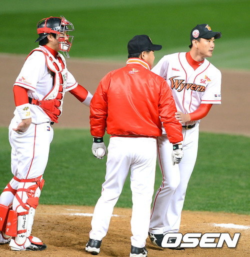 29일 오후 인천 문학구장에서 열린 '2012 팔도 프로야구' SK 와이번스와 삼성 라이온즈의 한국시리즈 4차전,6회초 무사 1,2루 SK 김광현이 교체되고 있다.