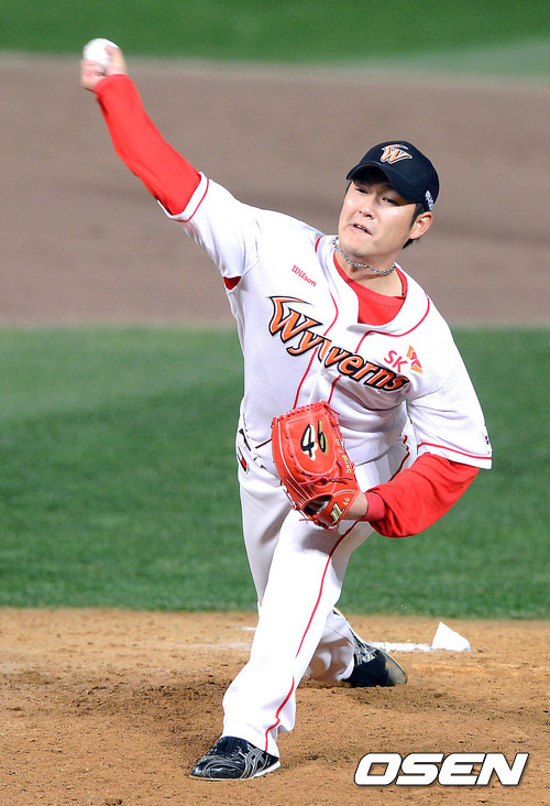 29일 오후 인천 문학구장에서 열린 '2012 팔도 프로야구' SK 와이번스와 삼성 라이온즈의 한국시리즈 4차전,6회초 SK 송은범 투수가 역투하고 있다