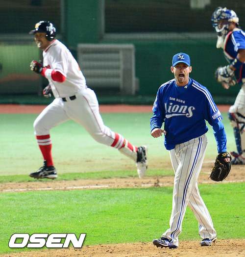 29일 오후 인천 문학구장에서 열린 '2012 팔도 프로야구' SK 와이번스와 삼성 라이온즈의 한국시리즈 4차전 경기 6회말 2사 이호준의 내야 땅볼 상황, 탈보트가 환호하고 있다.