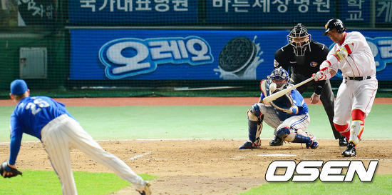 29일 오후 인천 문학구장에서 열린 '2012 팔도 프로야구' SK 와이번스와 삼성 라이온즈의 한국시리즈 4차전 경기 7회말 1사 1,3루 대타 조인성이 희생플라이를 치고 있다. 3루주자 박정권은 득점.