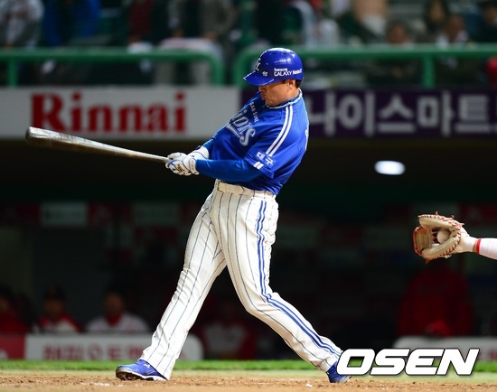 29일 오후 인천 문학구장에서 열린 '2012 팔도 프로야구' SK 와이번스와 삼성 라이온즈의 한국시리즈 4차전 8회초 무사 이승엽이 헛스윙 삼진 당하고 있다.