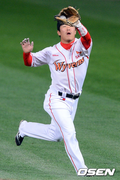 29일 오후 인천 문학구장에서 열린 '2012 팔도 프로야구' SK 와이번스와 삼성 라이온즈의 한국시리즈 4차전, 8회초 2사 삼성 최형우의 타구를 SK 정근우 2루수가 잡아내고 있다/