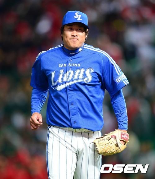 29일 오후 인천 문학구장에서 열린 '2012 팔도 프로야구' SK 와이번스와 삼성 라이온즈의 한국시리즈 4차전 8회말 마운드에 오른 정현욱이 세타자를 깔끔하게 처리하고 더그아웃으로 가고 있다.