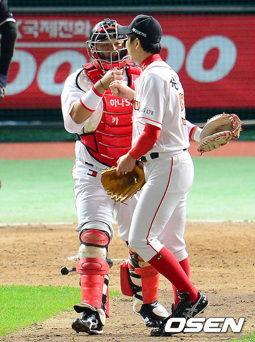 29일 오후 인천 문학구장에서 열린 '2012 팔도 프로야구' SK 와이번스와 삼성 라이온즈의 한국시리즈 4차전 경기 종료 후 조인성과 정우람이 하이파이브를 하고 있다.