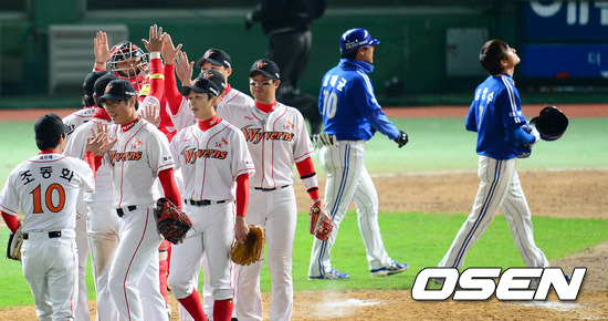 29일 오후 인천 문학구장에서 열린 '2012 팔도 프로야구' SK 와이번스와 삼성 라이온즈의 한국시리즈 4차전 경기 종료 후 SK 선수들이 하이파이브를 하는 가운데, 삼성 김상수가 그라운드를 빠져나가고 있다.