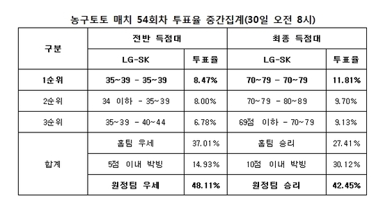 최종점수 LG, SK 양팀 모두 70점대 예상 최다…31일(수) 오후 6시 50분 마감
