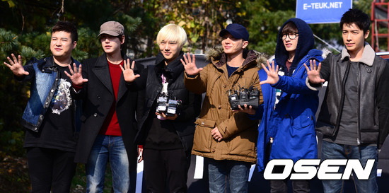 슈퍼주니어가 취재진에게 인사를 하고 있다.