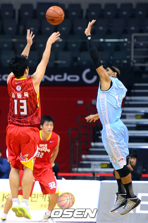 30일 오후 고양 실내체육관에서 열린 'KB 국민카드 2012-2013 프로농구' 고양 오리온스와 울산 모비스의 경기, 3쿼터 오리온스 김동욱이 3점 슛을 시도하고 있다.