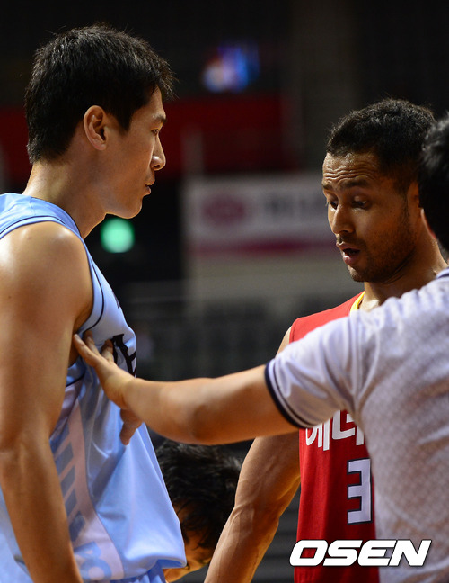 30일 오후 고양 실내체육관에서 열린 'KB 국민카드 2012-2013 프로농구' 고양 오리온스와 울산 모비스의 경기, 4쿼터 오리온스 전태풍이 모비스 박종천에게 파울을 범한뒤 박종천과 말싸움을 하고 있다.