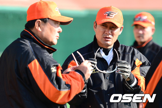 31일 오전 대전 한밭야구장에서 진행된 한화 이글스의 그라운드 훈련에서 이종범 코치가 김성한 수석코치와 이야기를 나누고 있다.
